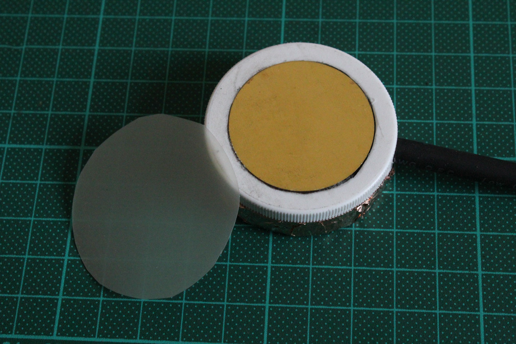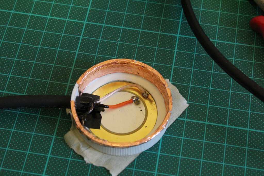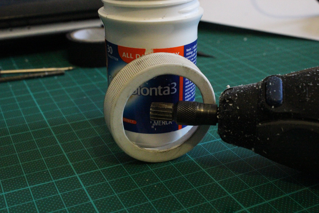 I used the lid from this vitamin bottle as a container for the Piezo element. It’s a soft plastic yet pretty sturdy and easy to work on. When making a test mic without it, I noticed it was way to fragile. The only thing you need to keep in mind is that the Piezo disc needs to sit flush with its container so it can make actual contact with the object you are going to record. Just drill a hole in the side for the audio connection. And to cut out the circular shape I used a Dremel with a routing bit.