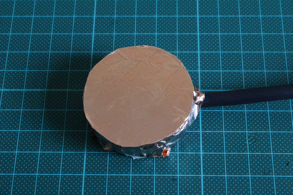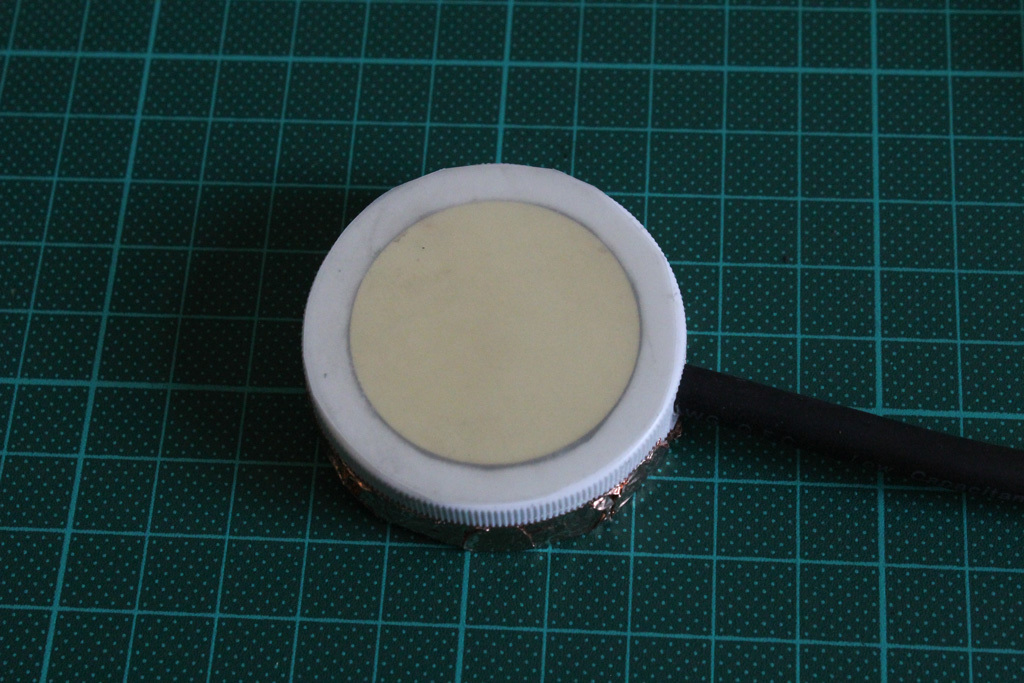The shielding wire is connected to the copper adhesive, positive wire (red) to the inner disc and the negative wire (translucent) to the outer disc.